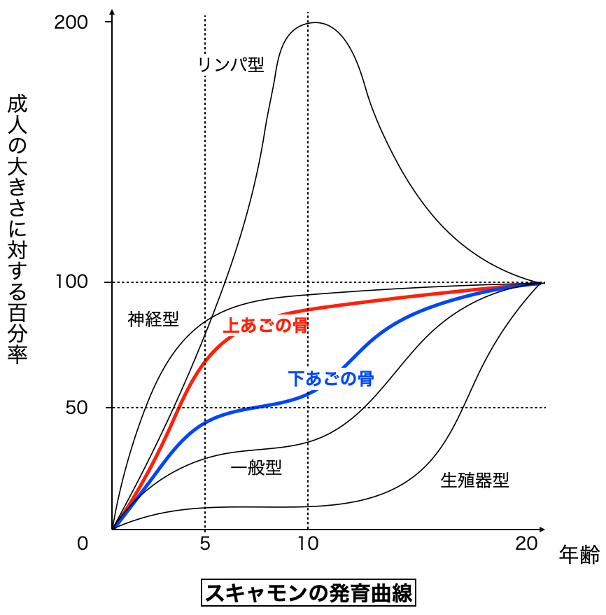 このグラフの通り上あごの成長はほぼ10歳までで成長を終えてしまいます。5歳からのピークを迎える時に背成長する力を利用すると良いでしょう。スペースを作ったりする骨の成長する力が一番あるのは4~9歳くらいまでの時期です。それを過ぎてしまうと成長する力が弱くなってきます。もうほとんどの歯が大人の歯になってしまている頃には口の中の成長が終わりに近づいてきています。